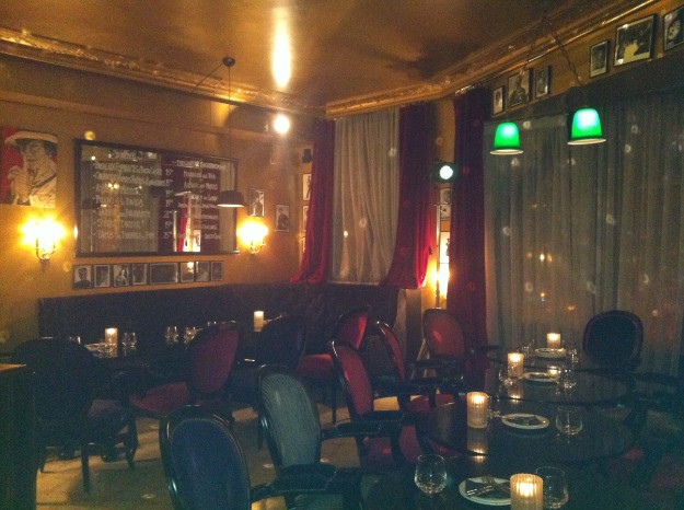 Al entrar, sólo se respira clandestinidad, en un ambiente de salón francés… El decorado te cautiva desde el primer instante, claramente no estás en un restaurante cualquiera: paredes y techo pintados en oro, una bola de espejos en el techo, una barra y taburetes al estilo inglés, varios muebles art-decó, un piano blanco, cortinas de terciopelo… parece que estés más en el Paris de Moulin Rouge que en un restaurante en medio de Barcelona.