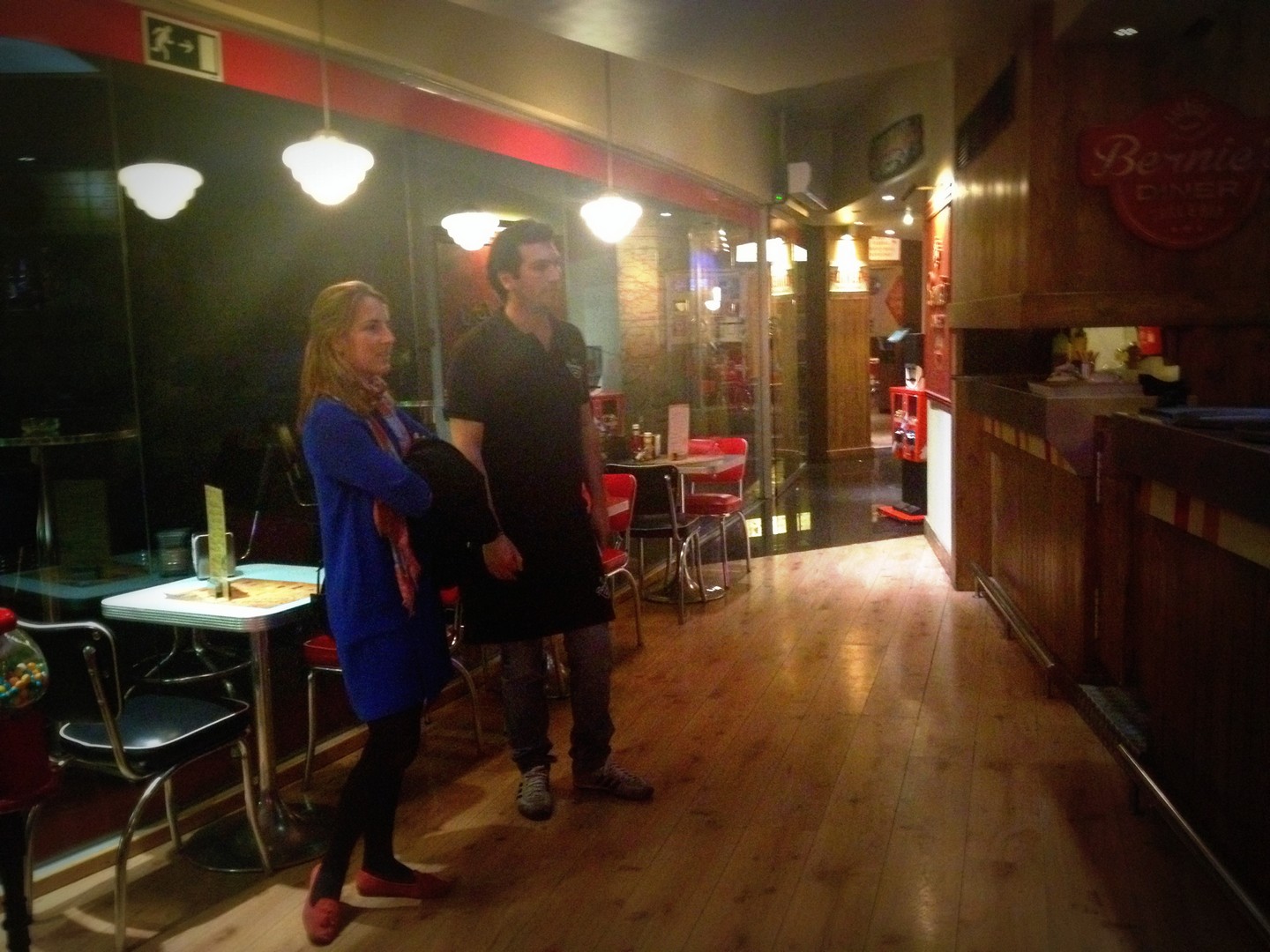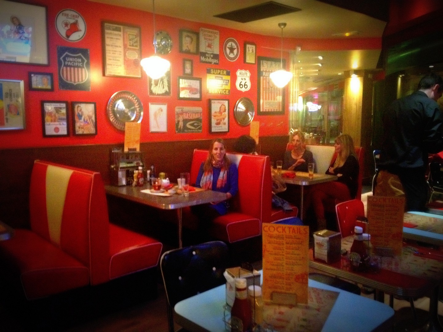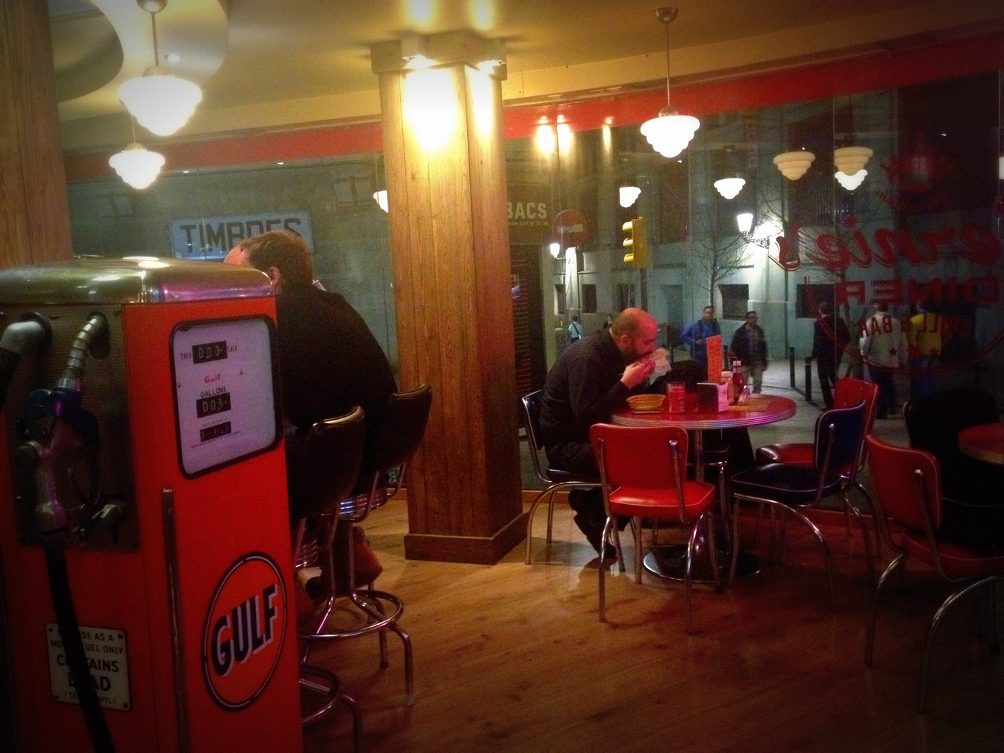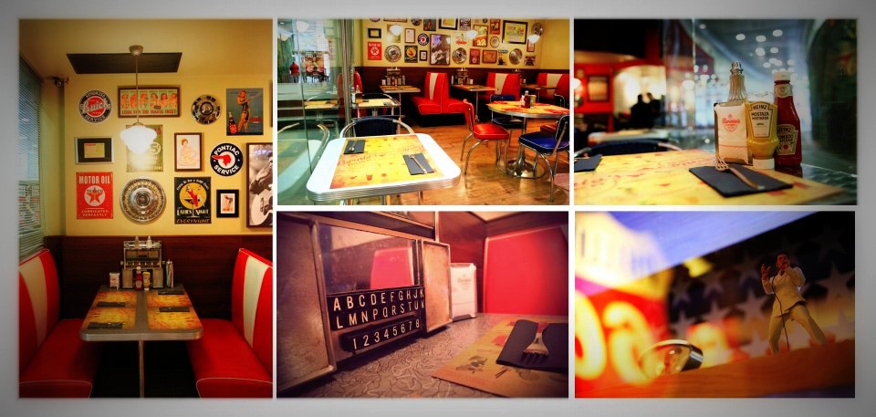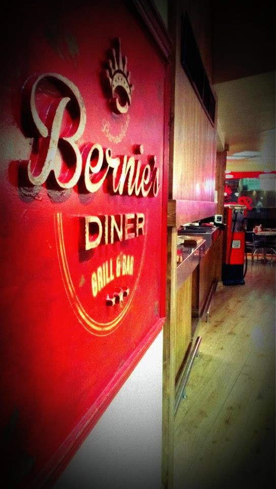 Bernie’s Diner pertenece a un grupo de amigos– uno portugués, un italiano, un americano, y un griego (que es el que lo lleva)- amantes del made in USA. Lo han decorado como el típico American Diner: bancos de cuero rojos, paredes forradas de carteles de los 50 y de la ruta 66, una barra al entrar… aquí podéis ver la decoración con detalle.