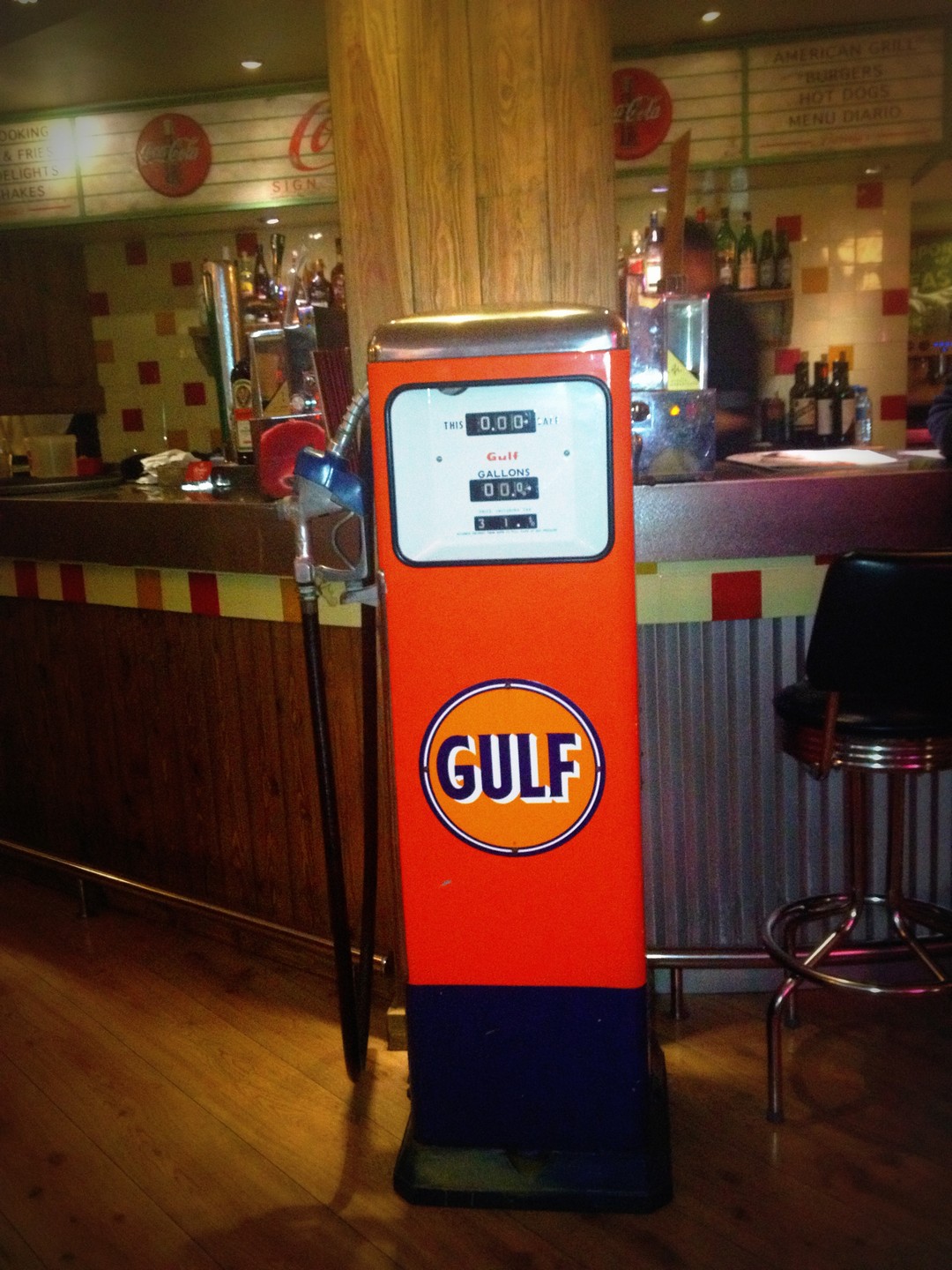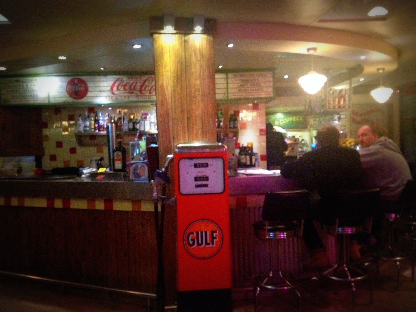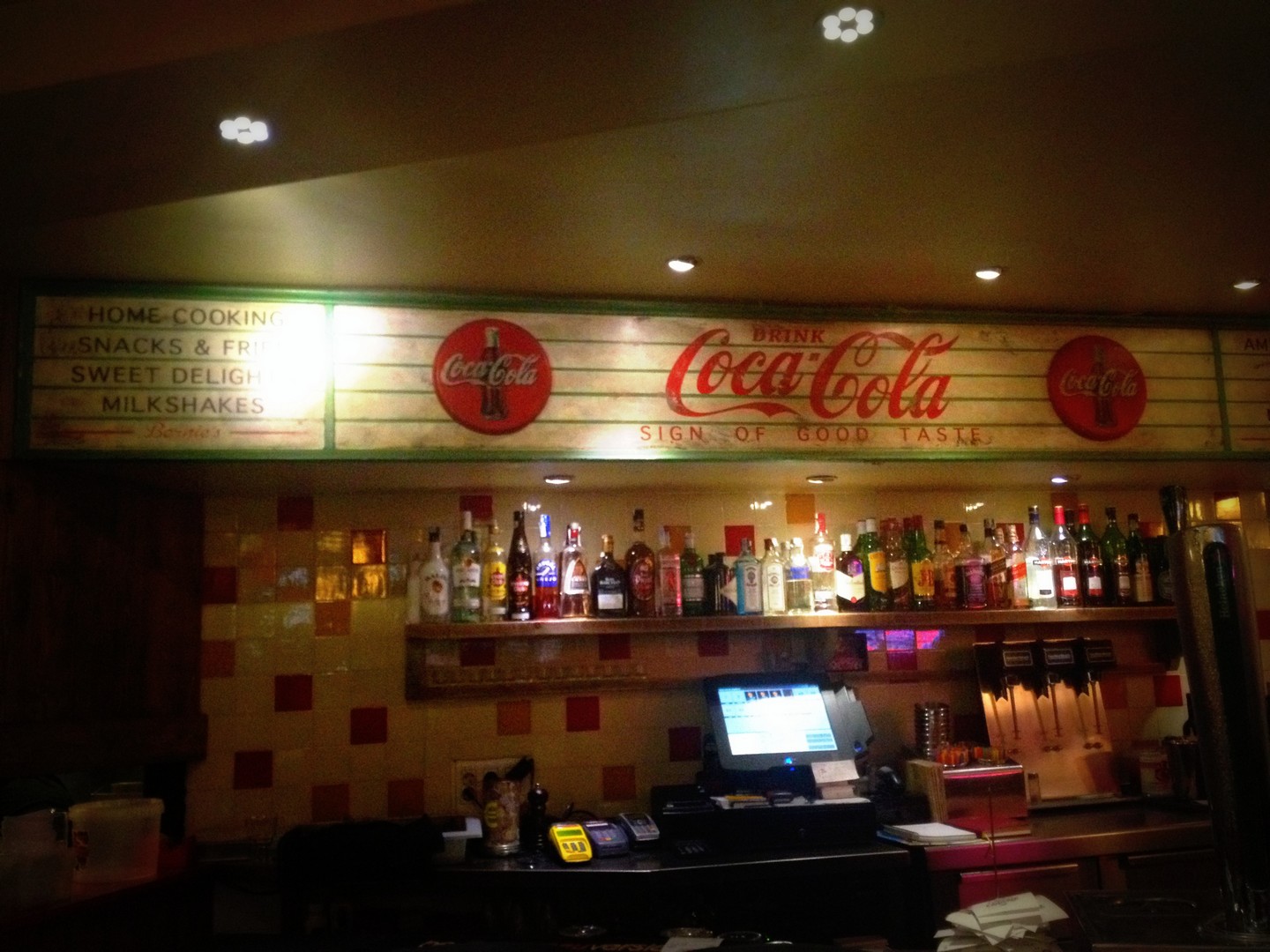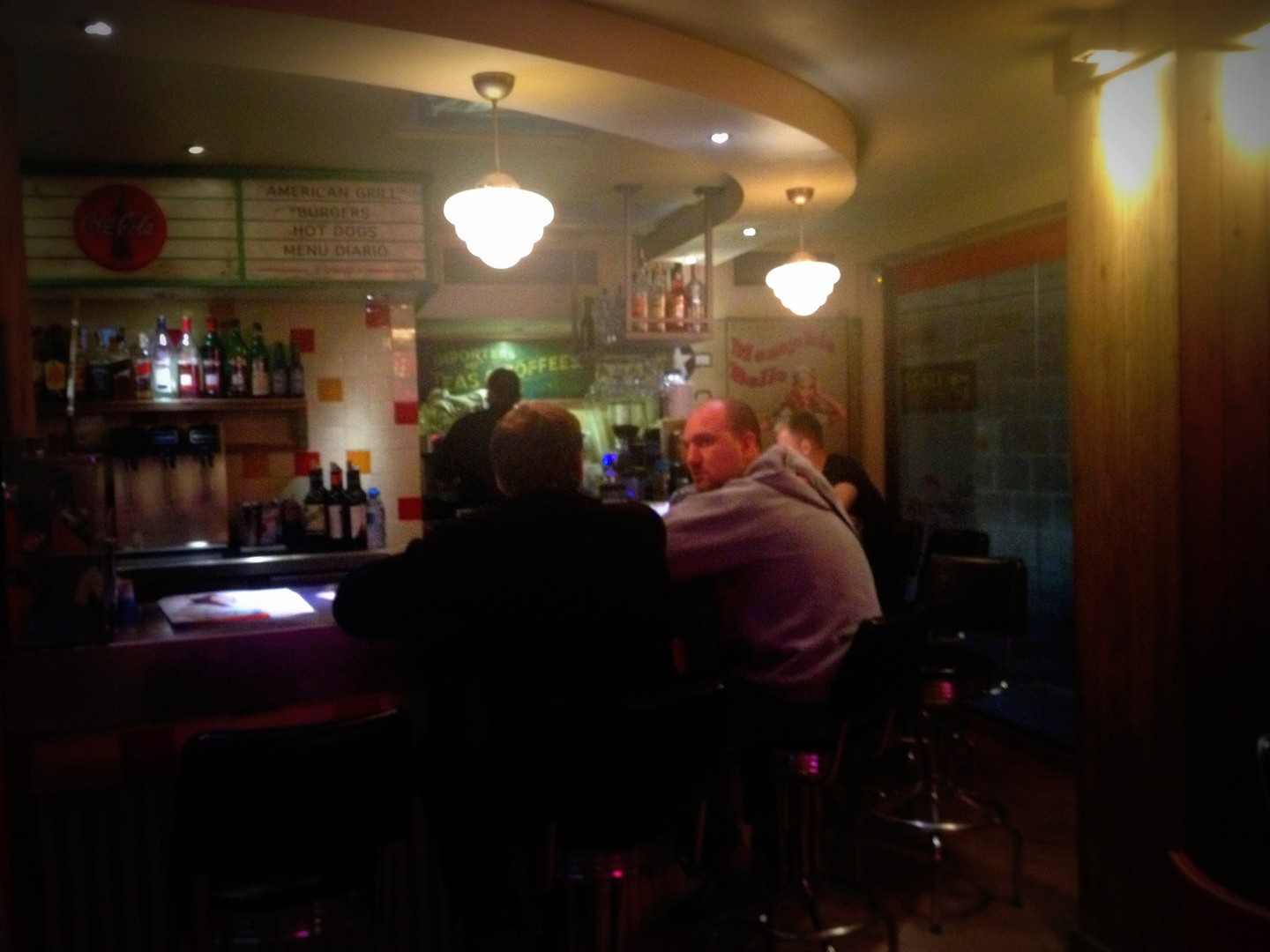 Bernie’s Diner pertenece a un grupo de amigos– uno portugués, un italiano, un americano, y un griego (que es el que lo lleva)- amantes del made in USA. Lo han decorado como el típico American Diner: bancos de cuero rojos, paredes forradas de carteles de los 50 y de la ruta 66, una barra al entrar… aquí podéis ver la decoración con detalle.