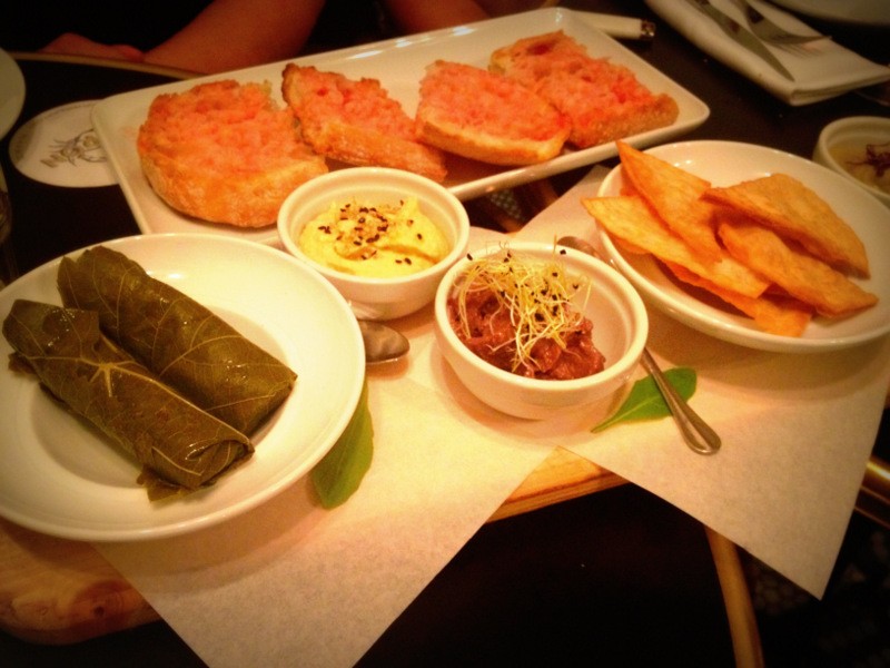Aperitivo de la casa: caviar de berenjena, hummus, olivada, hojas de parra rellenas y aceitunas