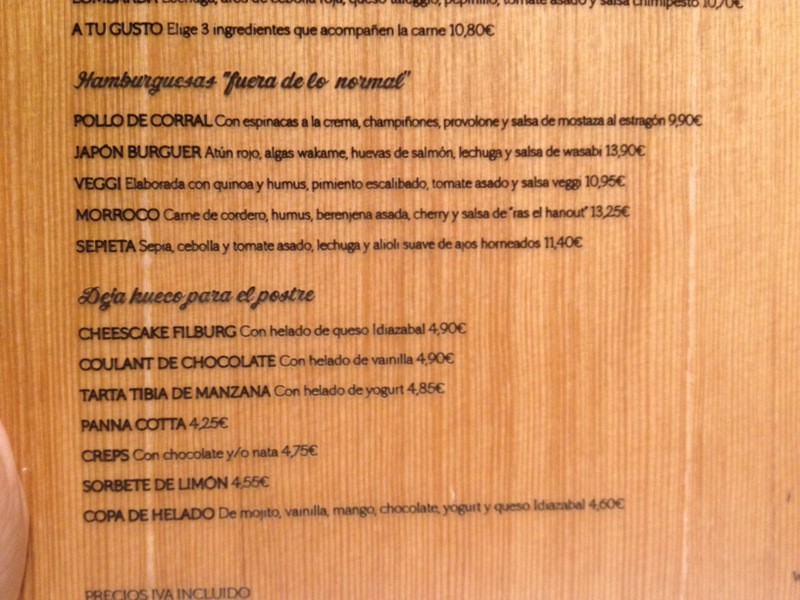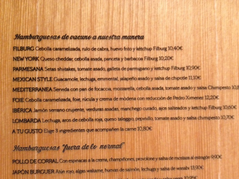 Precio: en mi opinión, Filburg tiene una excelente relación calidad-precio. Es muy barato por lo que comes. La hamburguesa más cara cuesta 13,90€.. la de foie (que suele ser cara y que será la próxima que pruebe), 12.20€. Comes por 15-25€ máximo… Según el vino que pidas también, claro!