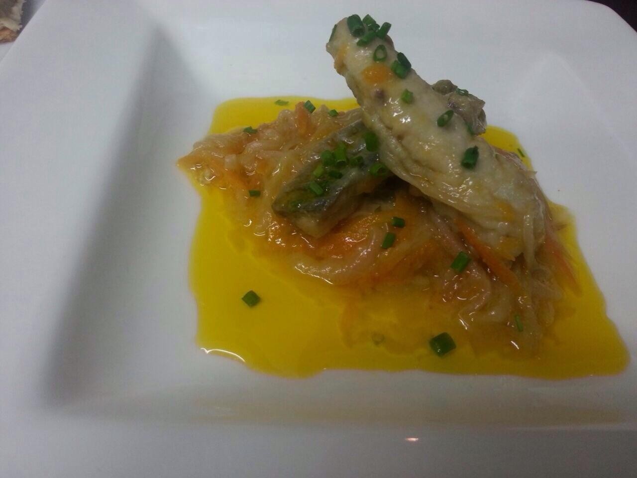 - Can Gregori (Manso, 46): Caballa en escabeche suave de zanahoria y cebolla tierna reducida con vinagre de manzana. Cerveza Guineu, Sitges de barril (cerveza artesana)