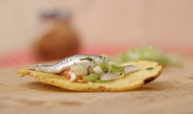 - El 20 metros: Patatón con boquerón, salsa de romesco y puerro. Caña.