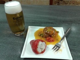 - La Bodega d’en Rafel: Albóndiga ecológica con pimiento del piquillo. (en la barra). Caña, copa de cava o vino.