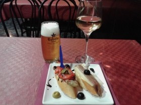 - Vinòdrom: Montadito de escalibada con anchoa. Caña.
