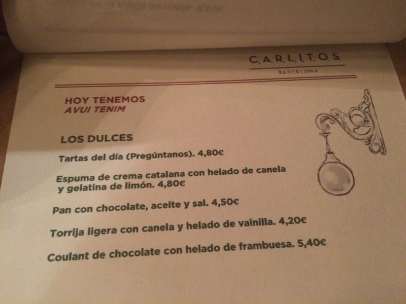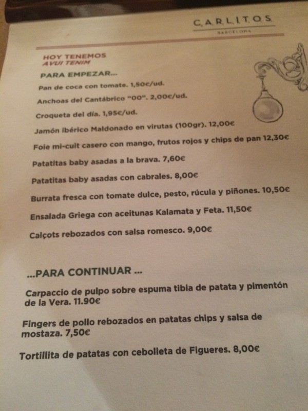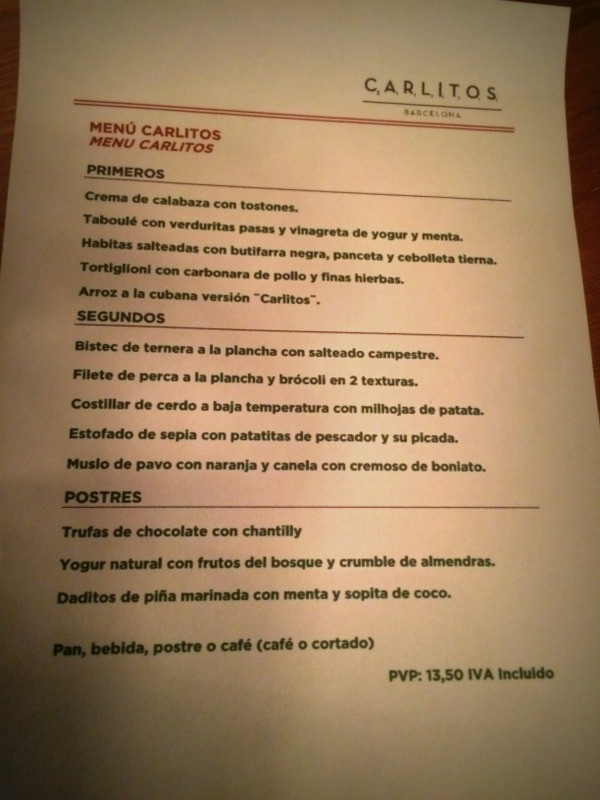 El precio medio de Carlitos es de unos 25€, y a mediodía hacen un menú que está genial (lo he probado varias veces), por 13,50€. Consta de 5 primeros y 5 segundos. Aquí podéis ver la carta completa y el menú de mediodía también!