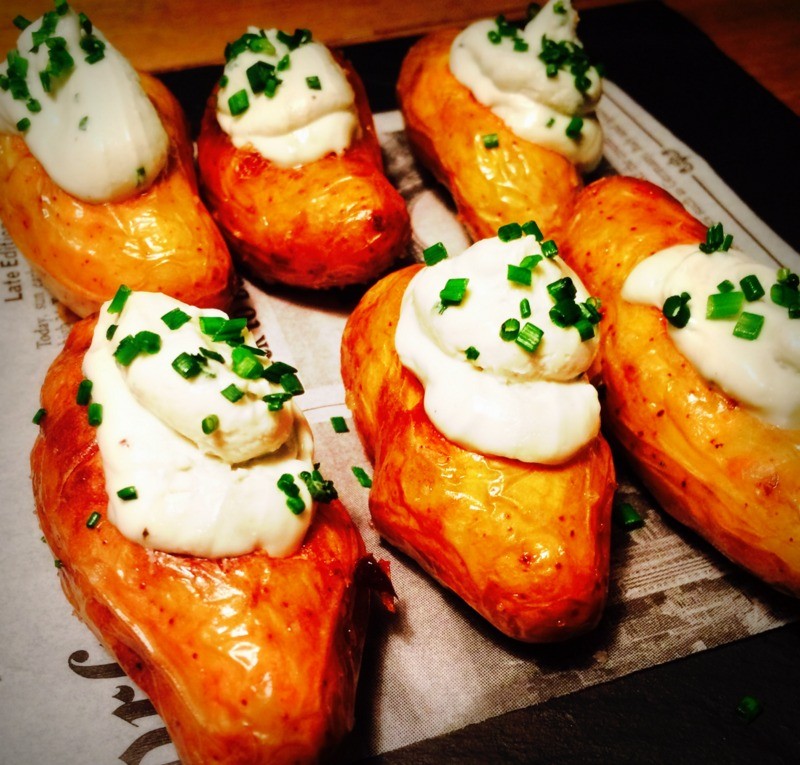 Croquetas de jamón, patatitas baby con espuma de cabrales, patatitas baby a la brava