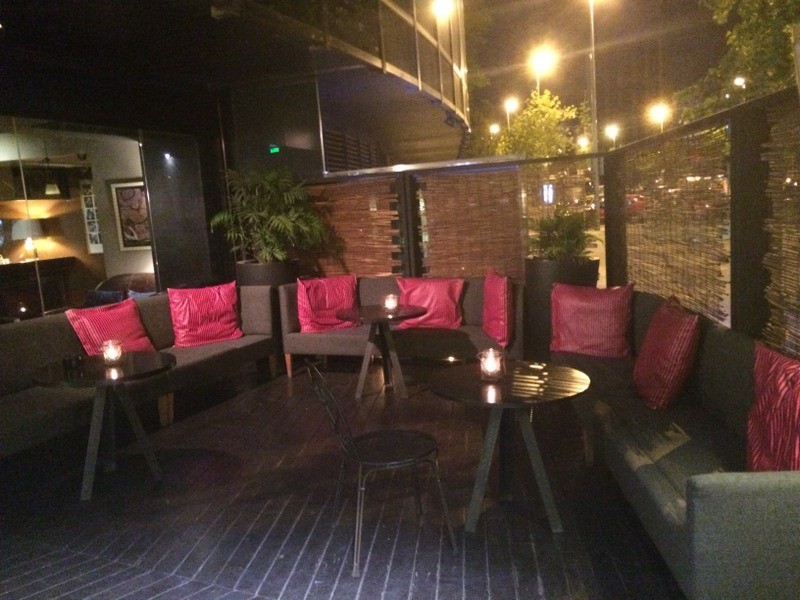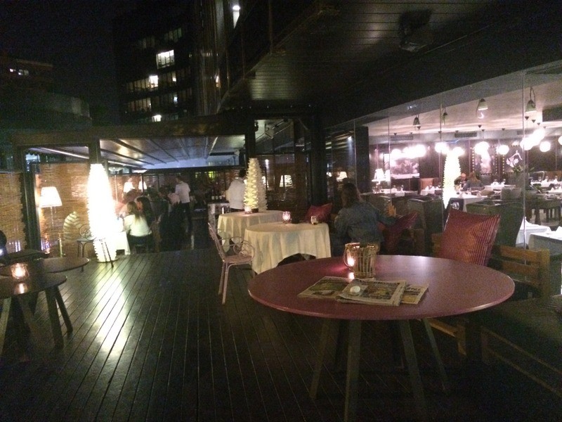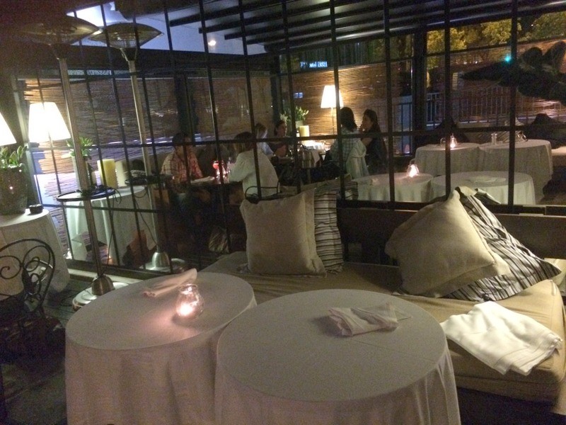 Mesas redondas, y una terraza ideal para comer o tomar copas (tiene zona con sofás) muy amplia, tranquila y agradable, con suelo de teca.
