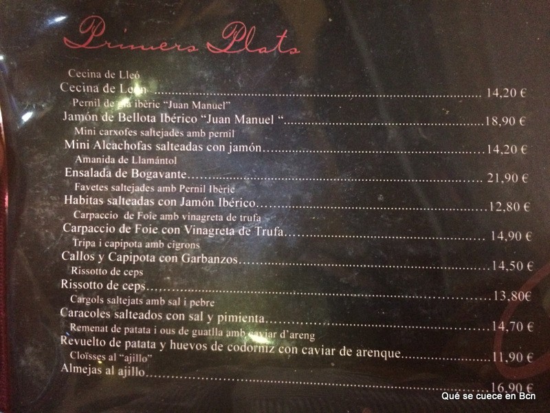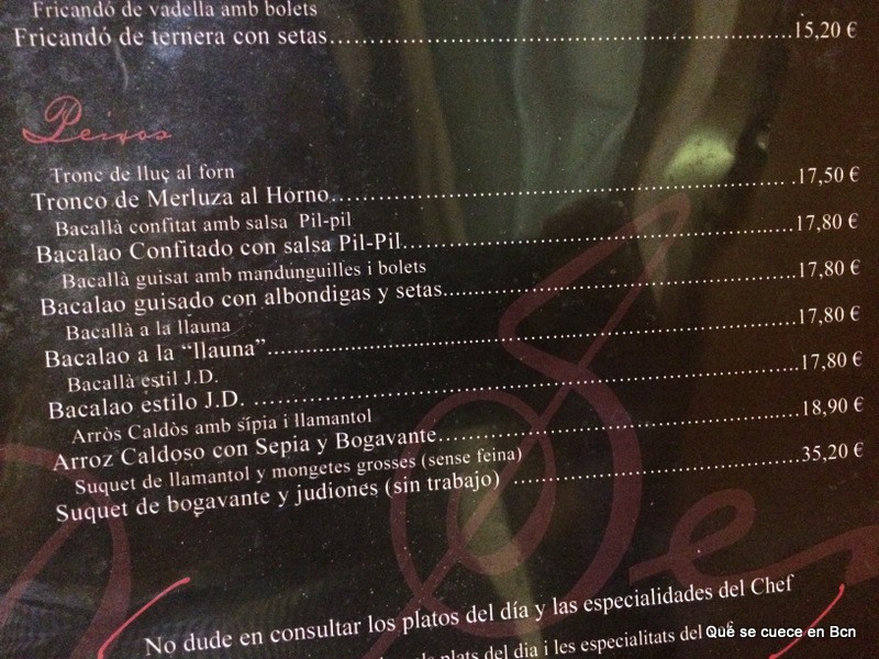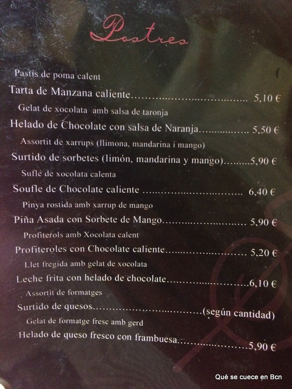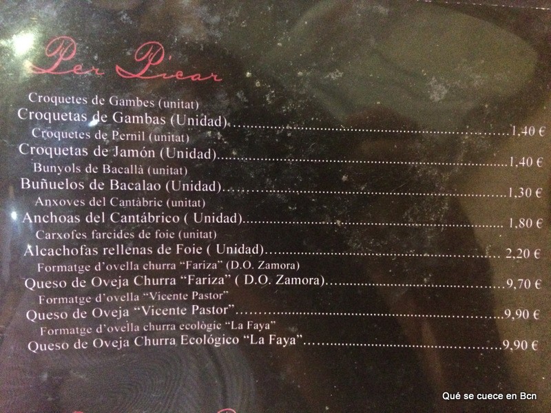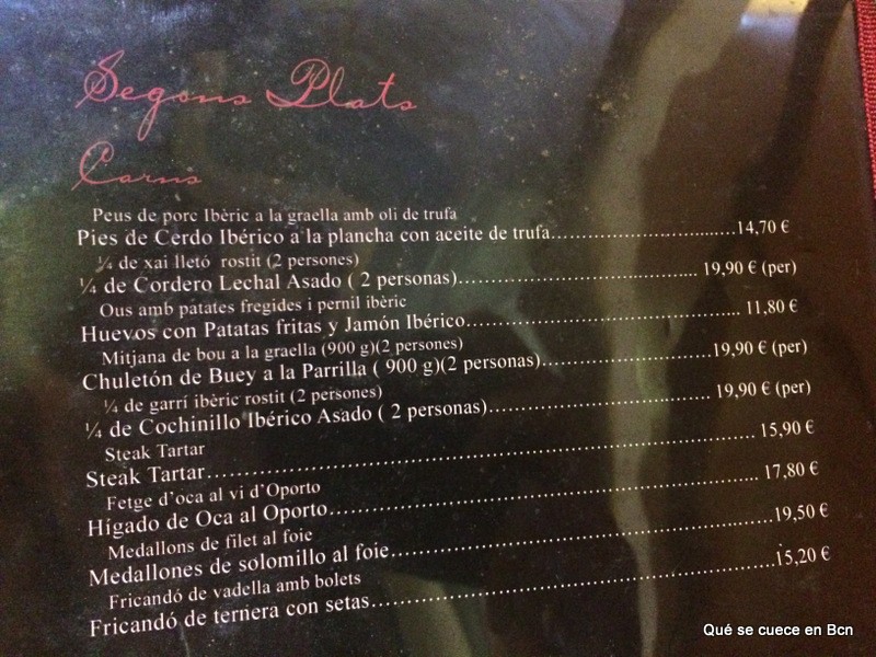 Todo lo que pedimos, excepto el Steak Tartar, estaba fuera de la carta. Todo exquisito. Lo más: los garbanzos con espardenyes y huevo frito. Éste es su plato estrella, que siempre que voy pido, y lo suelen tener fuera de carta. Aunque no lo ponen en la carta, podéis pedir medias raciones de casi todos los platos. Es lo que os aconsejo..así probaréis más cosas!