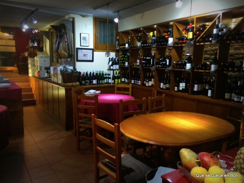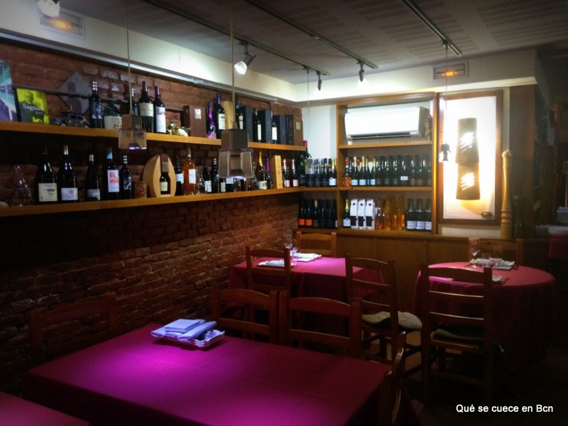 El local de Sense Pressa es pequeñito, dividido en dos zonas: la entrada, con dos mesitas, y el comedor principal (sin duda es el que os recomiendo). Éste es pequeñito, con mesas redondas, muy acogedor con las paredes forradas de botellas de vino.