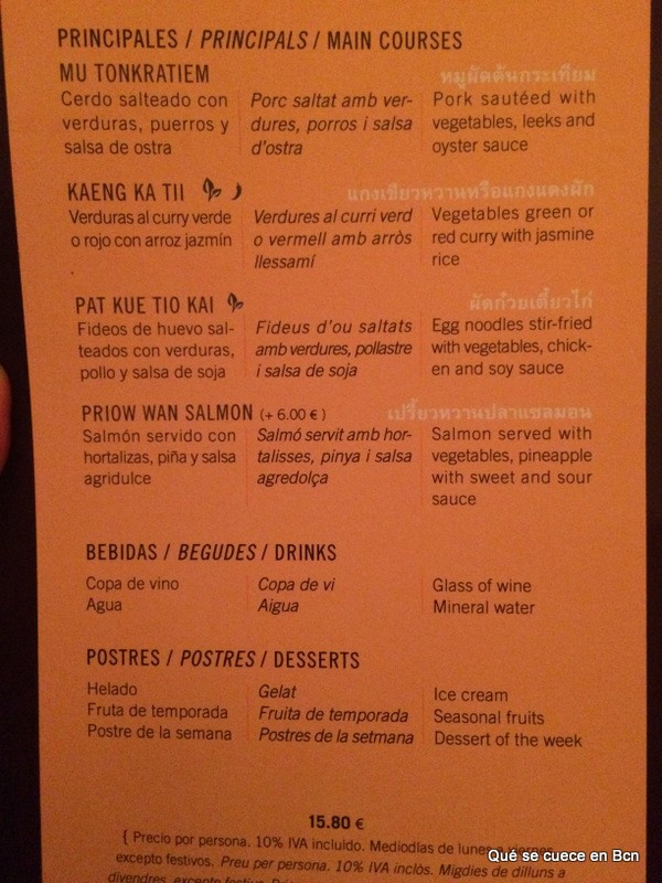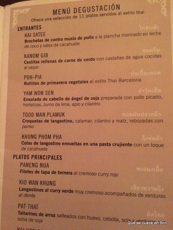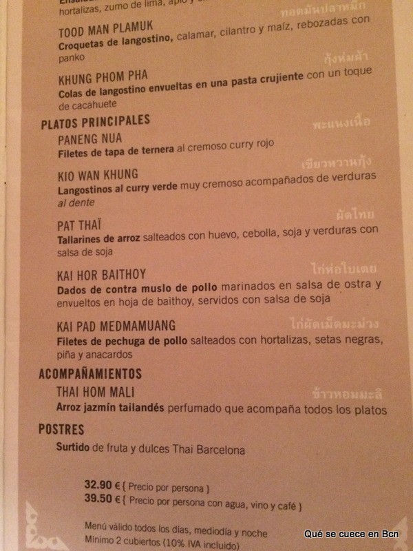 Menú muy completo y todo bueno! Lo mejor del menú: los Langostinos al curry verde y el Kai Pad Metmamuang!! El precio del menú es de 32.90€, y 39.50€ con bebidas. Precio correcto para lo que comimos!