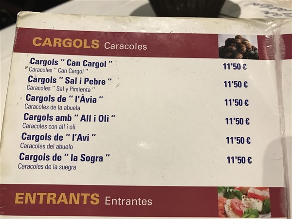 El precio medio de Can Cargol es de unos 20-25€/persona. Realmente bueno por la calidad de la comida y el trato del personal (súper amable y cercano). Aquí tenéis la carta completa:
