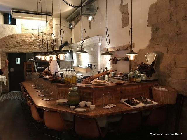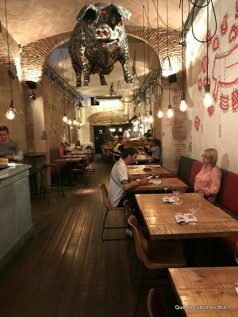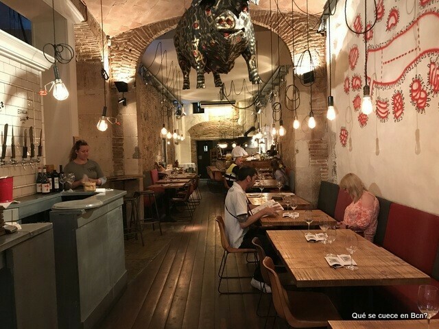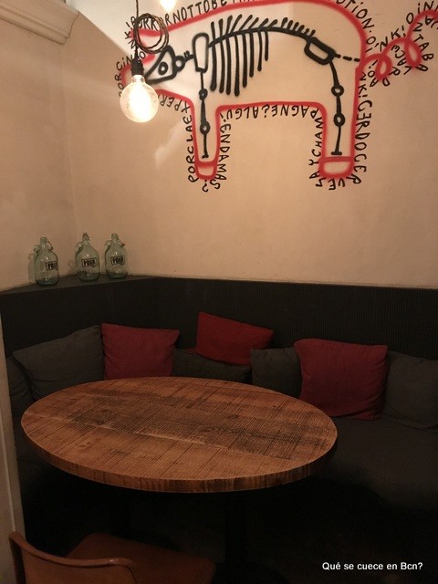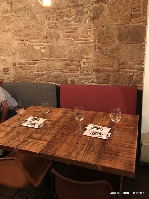 El local de PORK, boig per tu!, tiene un tamaño mediano, ni grande ni pequeño, decorado con luz cálida y con mobiliario de diferentes mercadillos de Europa y Nueva York. Al fondo a la derecha, la cocina vista. Vale la pena verla.