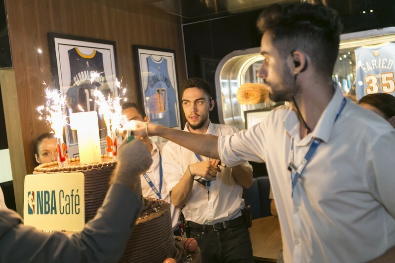 El ambiente de NBA Café Barcelona es lo mejor: los camareros súper amables, animados, van haciendo shows que encantan a los niños! Traen un pastel de cumpleaños todos saltando y cantando, a cada rato enfocan una mesa de los que están comiendo y la proyectan en todas las pantallas del restaurante, como hacen en los partidos de la NBA..