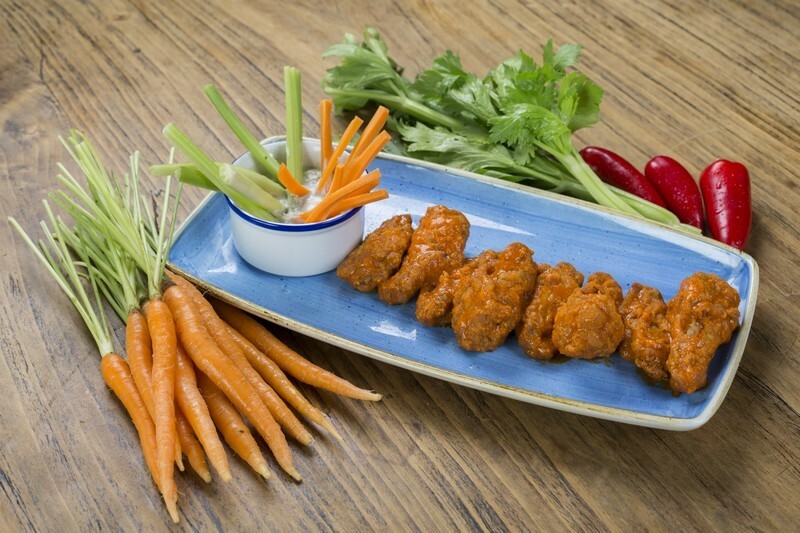 Buffalo Wings con salsa picante y crudités de apio y zanahoria con crema de queso azul