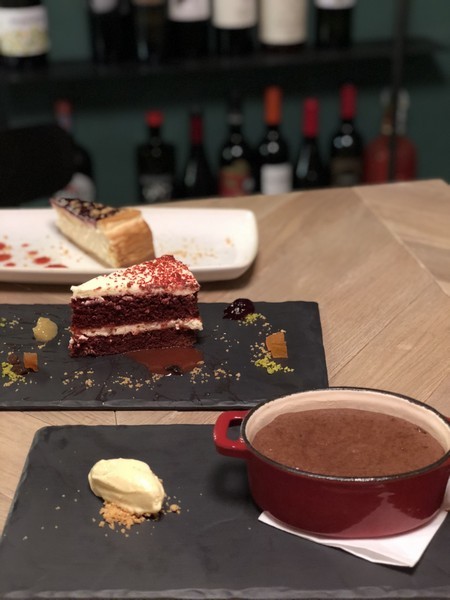 Crema de fruta de la pasión con espuma de coco y menta, Red Velvet, Coulant de chocolate con coulis de frutos rojos y Cheesecake con gelatina de limón