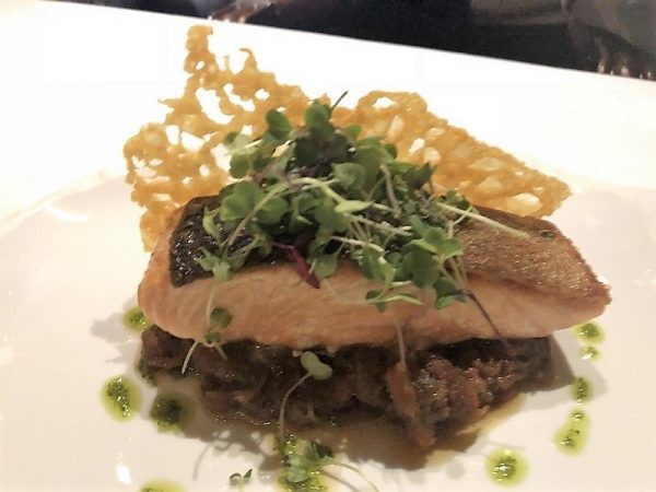 Salmón con sofrito de cebolla y tomate y teja de parmesano