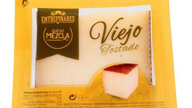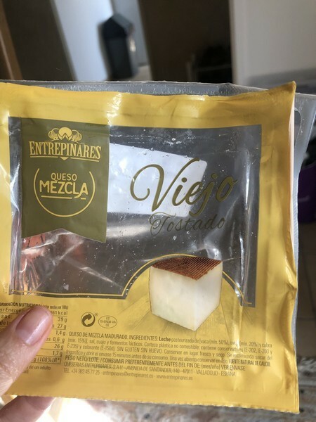 Ambos quesos son curados. El primero, de Lidl: queso al ajo negro. Sorprendente. Y el segundo, Queso tostado viejo Entrepinares, de Mercadona, ha ganado un premio a uno de los mejores quesos de España este 2018. Por eso ahora está siempre agotado.. mirad foto que le hice el otro día al lineal de Mercadona: