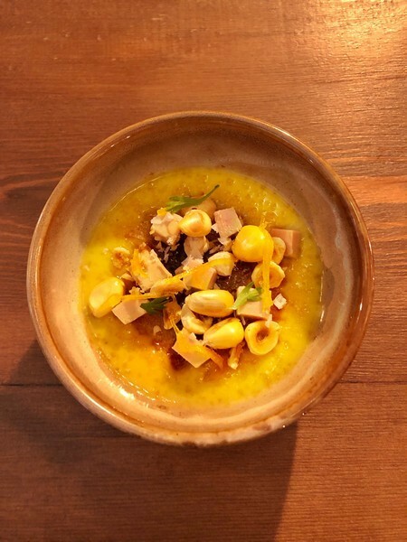Crema catalana, maíz, foie y avellanas