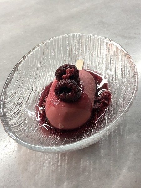 Pantera Rosa de chocolate blanco, rosas y frambuesas estofadas al vino