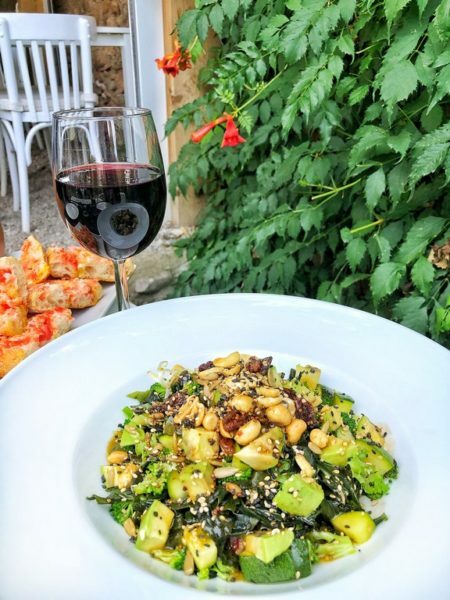 Ensalada verde, aguacate, algas, calabacín y frutos secos