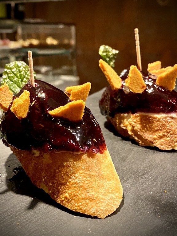 Merece una mención aparte el pintxo Orgásmico: queso fresco, mermelada de arándanos y galleta de piquillos picantes
