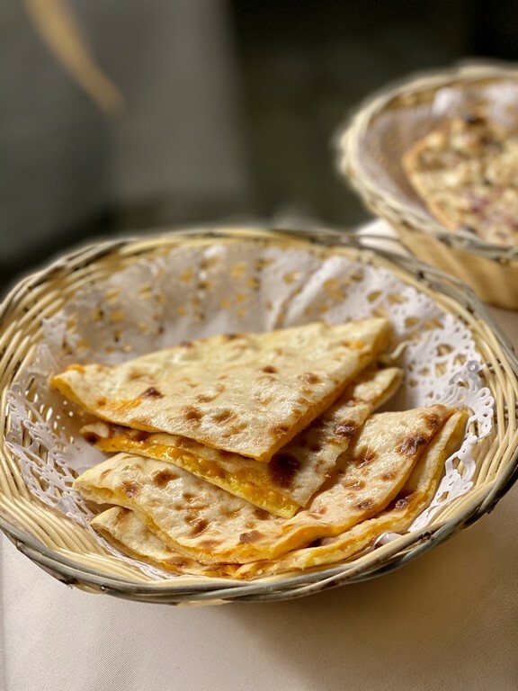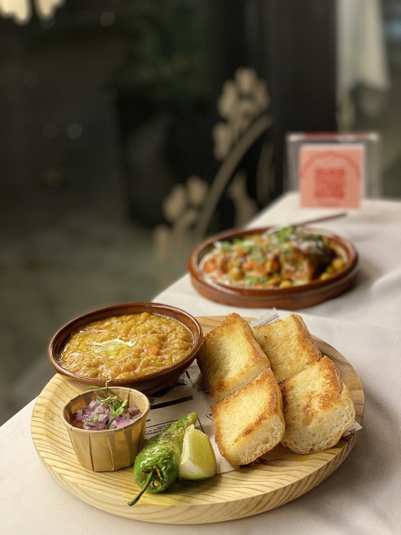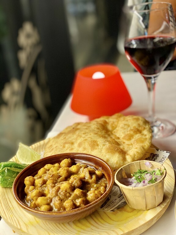 7️⃣ Chole bature garbanzos: Curry medio picante de garbanzos servido con bhatura (pan frito esponjoso y suave), halwa y encurtido de verdura