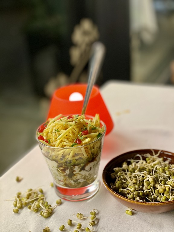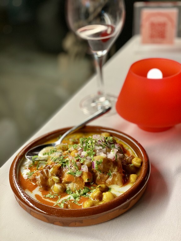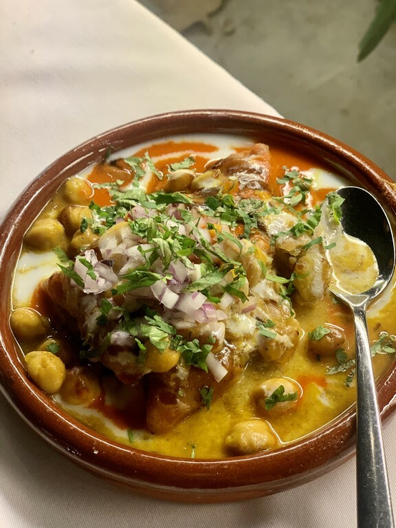 2️⃣ Gokul samosa chaat: samosa en lecho de garbanzos con menta